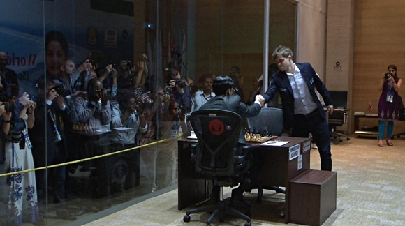 18.11.2013 - Für Magnus Carlsen gibt es beim derzeitigen Stand der Dinge bei der Schachweltmeisterschaft keinen Grund, etwas zu ändern, und so war der Norweger auch in der siebten Partie bereit, ein Berliner Endspiel zu spielen. Erneut lehnte Viswanathan Anand mit d3 ab und suchte nach einem Ansatz, um auf Gewinn zu spielen. Aber der führende Herausforderer ließ nichts zu und erreichte bald eine völlig ausgeglichene Stellung. Aus diesem Stein konnte der Weltmeister wirklich kein Wasser pressen und so fügte er sich in eine Zugwiederholung. Damit führt Carlsen mit 4,5 zu 2,5 und hat bei 5 ausstehenden Partien natürlich beste Chancen, der neue Weltmeister zu werden. Am Dienstag darf er die weißen Steine führen, aber wie uns der bisherige Matchverlauf lehrt, muss das kein Vorteil sein. Das A-Team ist in Zugzwang und wird fieberhaft daran arbeiten, den Rückstand schleunigst zu verkürzen.