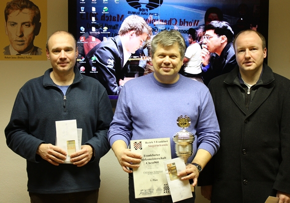 03.01.2014 - Zum Ausklang von 2013 fand im Training Center der Chess Tigers zum vierten Mal die Offene Frankfurter Chess960 Stadtmeisterschaft statt. Dieses Mal sicherte sich FM Klaus Schmitzer mit sagenhaften 6,5 Punkten den alleinigen Sieg. Lediglich IM Sven Telljohann gönnte er einen halben Punkt und verwies den Schönecker auf den zweiten Platz. Auch im dritten Versuch, seinen Premieren-Titel aus dem Jahr 2010 zu wiederholen, scheiterte FM Igor Zuyev. Er wurde Dritter und wird es mit ziemlich hoher Wahrscheinlichkeit 2014 wieder versuchen. Dazwischen liegt aber noch ein langes Schachjahr, in welchem es noch einige andere Chess960 Titel zu gewinnen gibt. Den Anfang macht schon am kommenden Montag der Beginn der 4. B9 Chess960 Rally. An diesem und den folgenden Montagen werden in der Brunnenstraße 9 (B9) in Bad Soden immer ab 19:00 Uhr insgesamt 12 Chess960 Turniere im Schnellschachmodus ausgetragen. Neben der Gesamtwertung lohnt es sich auch, auf Tagessiege zu spielen, denn der jeweilige Gewinner eines Turniers erhält einen hochwertigen Sachpreis. Am 25. Januar findet im SAALBAU Titus-Forum in der Frankfurter Nordweststadt die Chess960-Schnellschach-Einzelmeisterschaft 2013/14 des hessischen Bezirks 5 statt. Neben Ruhm und Ehre freuen sich 150,- Euro auf den Sieger. Weitere Informationen zu allen Turnieren und zahlreiche Bilder von der Frankfurter Chess960 Stadtmeisterschaft finden Sie im folgenden Text.