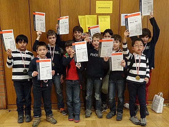 "Hibbdebach-Dribbdebach" - Die Phorms-Schule Campus Steinbach (Grundschule und Gymnasium) unter der Leitung von Club-Koordinator George Betts hat die Schachaktivitäten in diesem Jahr auch auf die Grundschule im Campus City in Frankfurt erweitert, sodass auch hier im nächsten Jahr bei dem Schulschachturnier ein weiteres Team zu erwarten ist. Stolz zeigen die zehn hier Ihre Urkunden.
