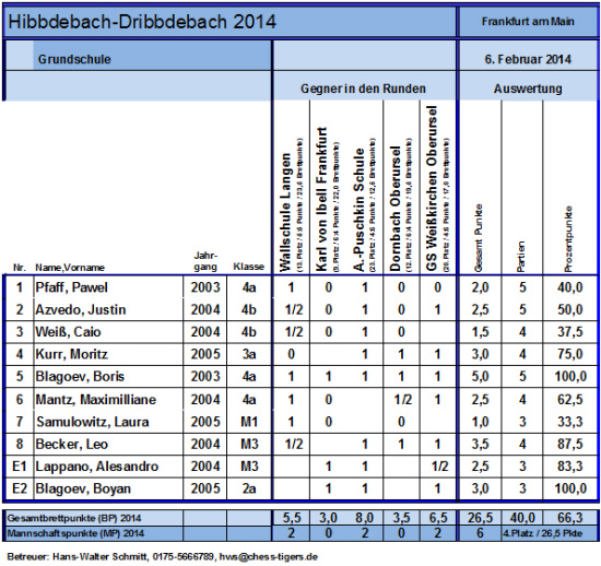 "Hibbdebach-Dribbdebach" - Die Geschwister-Scholl-Schule in Schwalbach ist erst seit 2,5 Jahren mit dem Schulschach unterwegs, obwohl die Keimzelle der Chess Tigers Schulschachs im Schulkinderhaus 1 im November 2005 ganz in der Nähe gestartet wurde und diese Schüler bilden auch heute noch mit den Haller-Brüdern, Ha-Young Ma, Leon Rosar und Allan Babino die größte Gruppe der Auswahlspieler und wir sind uns sicher, dass die talentierten Erstklässler Jannis Linz und Simon Rosar den starken Drittklässler-Jahrgang folgen werden. Ein ganz großes Dankeschön an das ganze Schulkinderhaus-Team um die Leiterinnen Cornelia Schmitt und Uschi Küttner.