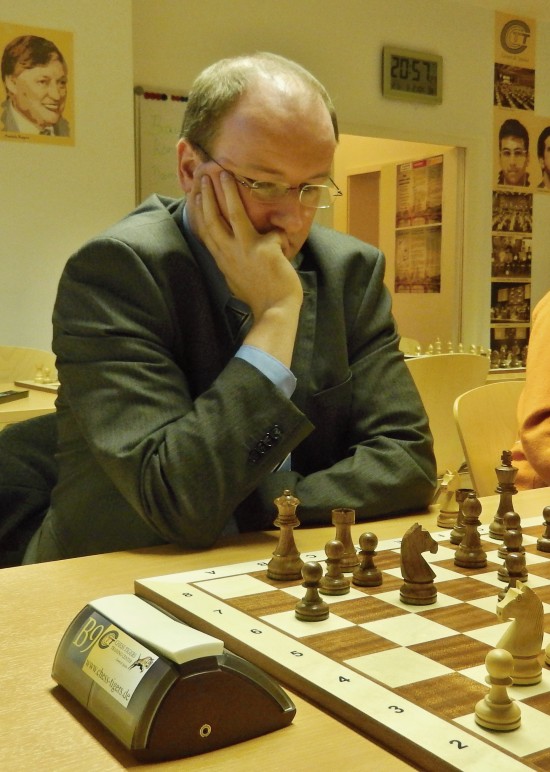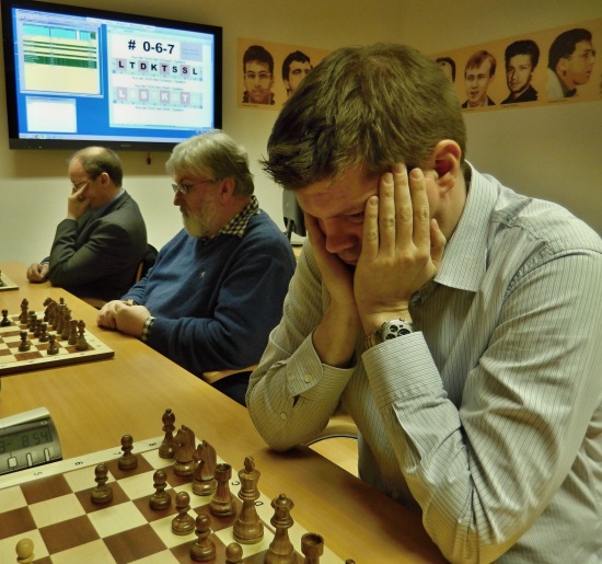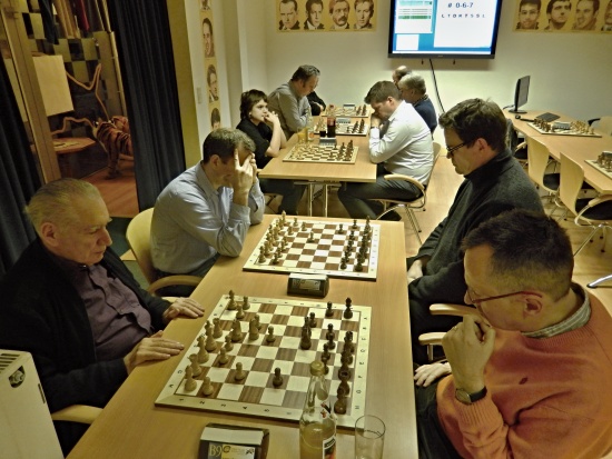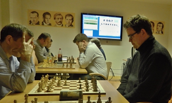 "Chess Rally Etappe 5" - Volker Svitek (SC Frankfurt-West) gegen Andreas Weber (SF Flörsheim) 1:0 im Vordergrund, hinten die Paarung der Schönecker Schachfreunde Patrick Chandler gegen FM Michael Stockmann 0:1