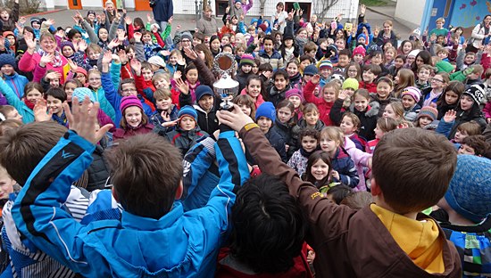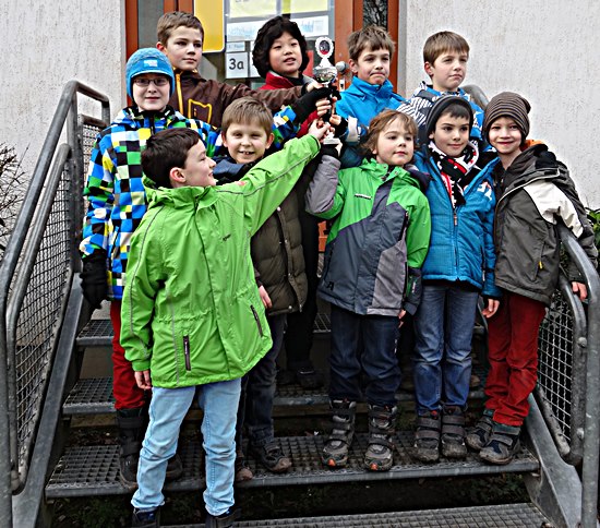 So sehen Sieger aus! Schließlich hatte jeder die Hand am Pokal, besser gesagt die Finger mit im Spiel beim Gedankenaustausch mit den anderen 26 Mannschaften der Grundschul-Klasse.