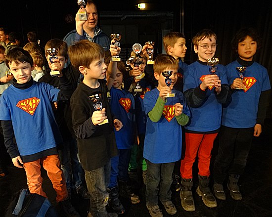 "Geschwister-Scholl-Schule" - Die Jungs ließen sich gemeinsam feiern, so, wie wenn das alles für sie Alltag sei. Die über dreihundert anderen Kinder skandierten und applaudierten ihren gleichaltrigen Schachhelden beim einzelnen Aufruf und langem Gang aus den Zuschauerrängen zur großen Tribüne (Treppe), wo alle Ehrungen abgehalten werden.