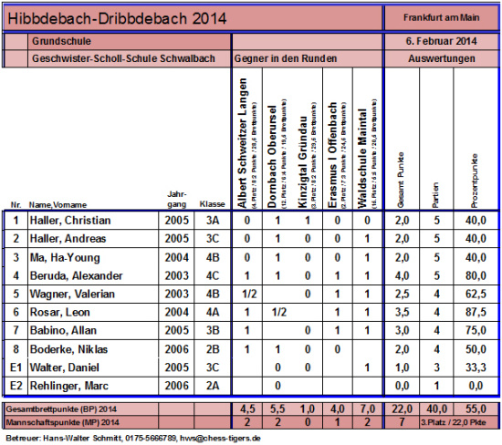 "Hibbdebach-Dribbdebach" - Die Geschwister-Scholl-Schule in Schwalbach ist erst seit 2,5 Jahren mit dem Schulschach unterwegs, obwohl die Keimzelle der Chess Tigers Schulschachs im Schulkinderhaus 1 im November 2005 ganz in der Nähe gestartet wurde und diese Schüler bilden auch heute noch mit den Haller-Brüdern, Ha-Young Ma, Leon Rosar und Allan Babino die größte Gruppe der Auswahlspieler und wir sind uns sicher, dass die talentierten Erstklässler Jannis Linz und Simon Rosar den starken Drittklässler-Jahrgang folgen werden. Ein ganz großes Dankeschön an das ganze Schulkinderhaus-Team um die Leiterinnen Cornelia Schmitt und Uschi Küttner.