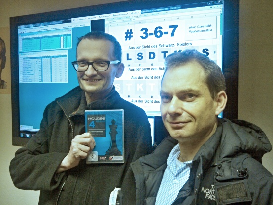 "Chess Rally Etappe 7" - Nach holprigem Start gegen Hans-Walter Schmitt und Hans-Dieter Post konnte IM Stefan Reschke den Etappen-Sieg ungefährdet mit 6:1 Punkten einfahren. Stefan entschied sich für Weiterbildung: Houdini 4 Der neugebackene deutsche Lehrermeister Volker Svitek griff wieder erfolgreich in den Hut und entschied sich dann für ein hochprozentiges, geistiges Getränk aus Moskau! Wem, was am besten geholfen hat, wird sich heute Abend zeigen.