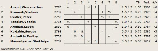 Gespielt wird ein doppelrundiges Turnier mit acht Teilnehmern. Die Bedenkzeit ist: 120 Minuten für 40 Züge, 60 Minuten für 20 Züge und dann 15 Minuten für den Rest der Partie plus 30 Sekunden pro Zug ab dem 61. Zug.