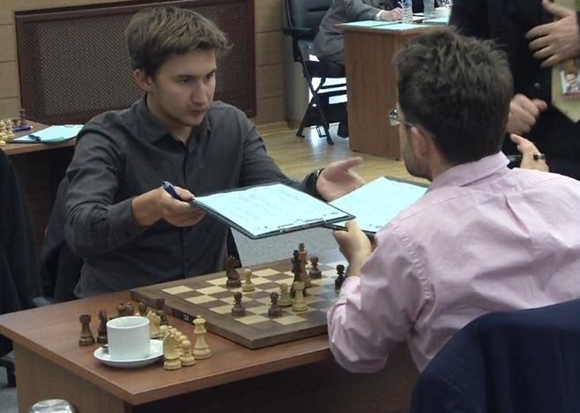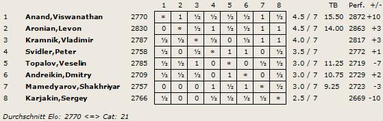 21.03.2014 - Mit der heutigen 7. Runde des Kandidatenturniers ist exakt die Hälfte geschafft, und einige Spieler müssen sich mit sehr hoher Wahrscheinlichkeit spätestens jetzt von allen Hoffnungen auf ein WM-Match gegen Magnus Carlsen verabschieden. Andere dagegen dürfen sich glücklich schätzen, noch im Rennen zu sein. Allen voran haben Viswanathan Anand und Levon Aronian mit 4,5 Punkten die Nase vorn. Während der Inder gegen Peter Svidler remisierte, gelang dem Armenier (mit Schwarz!) gegen Sergey Karjakin der bereits dritte Sieg im Wettbewerb. Ebenfalls dran ist auch Vladimir Kramnik, aber der heutige Sieg gegen Shakhriyar Mamedyarov war mehr als glücklich. Am Rande der Niederlage ließ sich der russische Hüne reich beschenken und einen niedergeschlagenen Shak zurück. Ähnlich wie der Aseri dürfte sich Veselin Topalov fühlen, der aus der Eröffnung heraus von Dmitry Andreikin überspielt wurde. Der Russe gab damit die roterne Laterne an Karjakin ab, dessen WM-Träume geplatzt sein dürften. Es müsste schon ein Wunder geschehen, wenn der nächste WM-Herausforderer nicht Anand, Aronian, Kramnik oder Svidler lauten würde. Entsprechend ist zum Auftakt der Rückrunde mit vertauschten Farben morgen das Duell Aronian gegen Anand die Top-Partie. Ab 10 Uhr können Sie die Partien wieder live verfolgen. Bei ChessBase kommentieren GM Dr. Karsten Müller und IM Oliver Reeh das Geschehen. Zur Halbzeit steht es in Sachen Siegen übrigens 11:2 für Weiß. Die einzigen Schwarzsiege schafften die führenden Anand und Aronian.