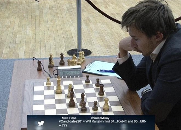 Hier wähnte sich Aronian bereits angeblich in einer deutlich schlechteren Stellung, aber Vishy bemerkte, dass man Lev nicht immer ernst nehmen darf...