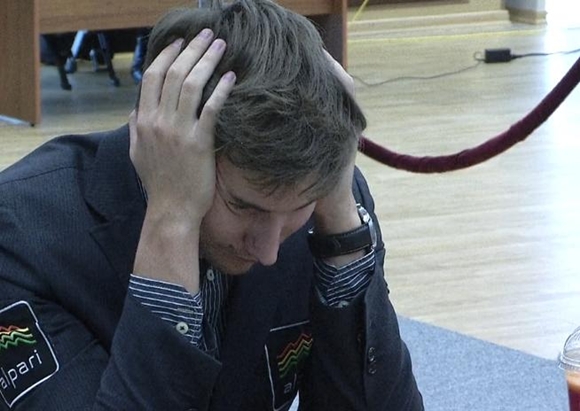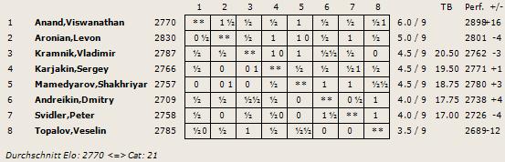 23.03.2014 - Die heutige 9. Runde des Kandidatenturniers hätte aus Sicht des 15. Weltmeisters Viswanathan Anand nicht besser laufen können. Während er nach einem Najdorf-Sizilianer (mit 6.h3) Veselin Topalov die ewige Schwäche e6 zugefügt hatte, konnte der Inder parallel zuschauen, wie seine ärgsten Konkurrenten um den Turniersieg in turbulenten Partien in die Mangel gerieten. Levon Aronian hatte Schwarz gegen Shakhriyar Mamedyarov und verlor in einer taktisch geführten Partie als Erster den Überblick. Zu diesem Zeitpunkt war auch schon klar, dass Sergey Karjakin endgültig aus dem Winterschlaf erwacht ist, denn er setzte Vladimir Kramnik aus der Eröffnung heraus schwer zu. Vermutlich stellte der 14. Weltmeister bereits im 7. Zug einfach einen glatten Bauern ein, den er nie wieder sah. Nach langem Kampf musste er Karjakin zu dessen zweiten Sieg in Folge gratulieren. Geht da etwa noch was bei dem einstigen Tabellenschlusslicht? In der Zwischenzeit hatte Anand seinen positionellen Vorteil in einen materiellen umgewandelt und das Damenendspiel mit Mehrbauer für sich entschieden. Dass die Partie Dmitry Andreikin gegen Peter Svidler (ebenfalls Najdorf mit 6.h3) remis endete, wird für den Ausgang des Turniers nebensächlich sein, beide Spieler sollten keine Chance mehr auf den Gesamtsieg haben. Vishy Anand führt mit 6/9 vor Aronian 5/9 und drei 4,5lern namens Kramnik, Karjakin und Mamedyarov. Die Freude über den morgigen Ruhetag dürfte auf Spielerseite allenthalben groß sein - frische Ideen müssen her, wenn man Weltmeister werden oder zumindest (wieder) gegen Carlsen spielen will!