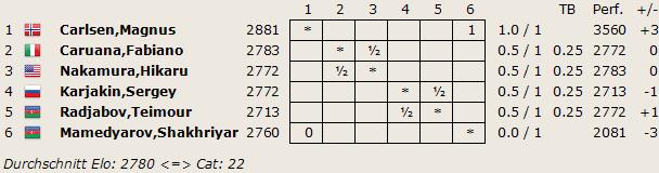 Zwei Turniere finden parallel statt. Im A-Turnier spielen sechs Teilnehmer ein doppelrundiges Turnier. Am Start sind Magnus Carlsen, Fabiano Caruana, Hikaru Nakamura, Sergey Karjakin, Shakhriyar Mamedyarov und Teimour Radjabov.