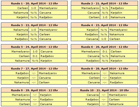 Rundenstart ist täglich um 12 Uhr. Die letzte Runde des A-Turniers beginnt um 10 Uhr. Am 25. April wird der einzige Ruhetag eingelegt.