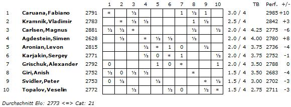 Mit einem ELO-Schnitt von 2773 wurde in diesem Jahr noch haarscharf die Turnierkategorie 22 verpasst.