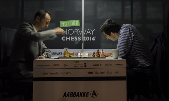 09.06.2014 - Gestern war Vladimir Kramnik noch der strahlende Tabellenführer, als er mit immenser Hilfe Fabiano Caruanas in Runde 5 des No Logo Norway Chess 2014 siegte. Doch Freud und Leid liegen auch im Schach nicht allzu weit auseinander, und so setzte es heute für den 14. Weltmeister ausgerechnet gegen Veselin Topalov eine Niederlage. Weder vor noch nach der Partie gaben sich die Streithähne die Hand, und die vertraglich vereinbarte Pressekonferenz verweigerte die russische Diva ebenfalls. Kramnik musste die alleinige Führung gleich wieder abgeben, doch immerhin konnte ihn niemand überholen. Sowohl Caruana als auch Magnus Carlsen holten heute gegen Simen Agdestein beziehungsweise Sergey Karjakin "nur" ein Remis und liegen somit gleichauf mit Kramnik vorn. An seinem heutigen Geburtstag genehmigte sich Kommenator GM Klaus Bischoff einen Ruhetag, doch Runde 7 am Dienstag wird er wieder für Sie live bei ChessBase kommentieren.
