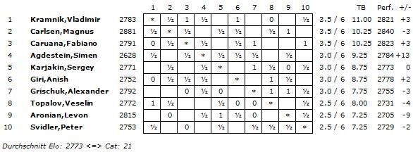 Mit einem ELO-Schnitt von 2773 wurde in diesem Jahr noch haarscharf die Turnierkategorie 22 verpasst.