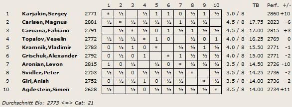 Mit einem ELO-Schnitt von 2773 wurde in diesem Jahr noch haarscharf die Turnierkategorie 22 verpasst.