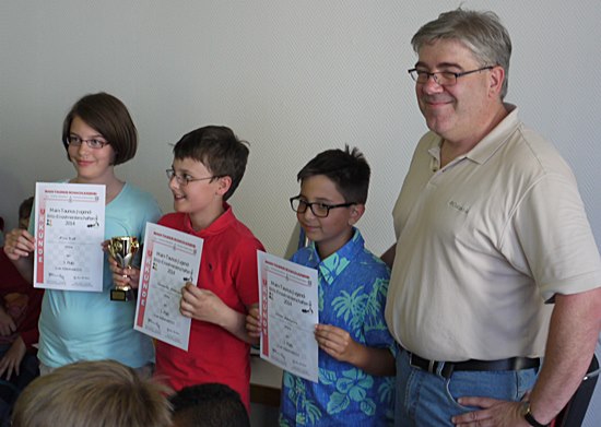 Mit Urkunden v.l.n.r: Alina Kick, SC Frankfurt-West, 3.Platz (+9/=0/-4) / Constantin Ackermann, SV Hofheim, Sieger (+13/=0/-0) und Viktor Edelmann, SC Frankfurt-West, 2.Platz, (+10/=0/-3). Im Hintergrund der souveräne Turnierleiter Günter Weber.