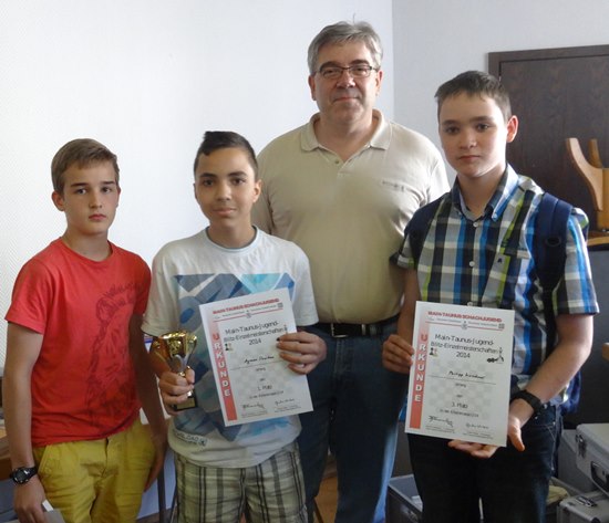 Mit Urkunden v.l.n.r: Anton Pyshny SC Eschborn, Sieger / Ruben Rittberger, SC Bad Soden, 2.Platz / Aaron Arnold, SC Frankfurt-West, (3.Platz). Rechts: Turnierleiter Günter Weber.