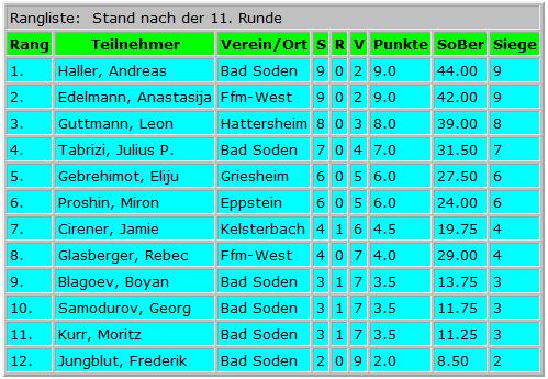 Es wurde einrundig gespielt mit insgesamt 11 Partien je Teilnehmer.
