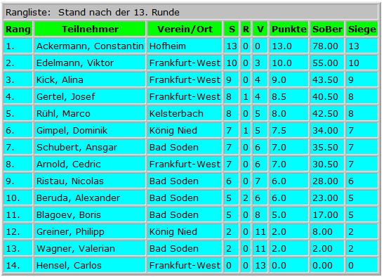 Es wurde einrundig gespielt mit insgesamt 13 Partien je Teilnehmer.