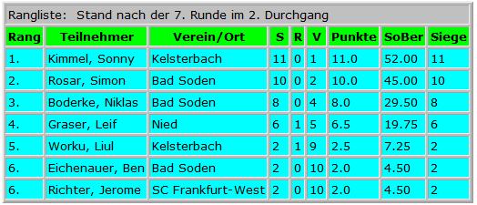 In der 12er-Gruppe der U10 gab es schließlich ein spannendes Rennen zwischen dem Bad Sodener Andreas Haller und der Westlerin Anastasija Edelmann, welches am Ende bei jeweils 9:2 Punkten in einem toten Rennen endete trotz der besseren Wertung 44,0 zu 42,0 Sonnenborn-Berger zugunsten des Bad Sodeners. Ein Stechen war angesagt mit zwei Partien. In sehr wechselvollen Verlauf endete die 1.Partie mit einem 1:0 für Anastasija, aber in der 2.Partie glich Andreas mit einem schönen Matt aus. Auf Vorschlag des Chess Tigers Team-Kapitän Hans-Walter Schmitt wurde aus Gründen der fortgeschrittenen Zeit und der Tatsache, dass beide den Sieg verdient hätten, auf zwei Sieger entschieden. Andreas bekommt den Pokal in der nächsten Woche noch nachgeliefert. Beide Kinder waren sichtlich mit der Entscheidung mehr als glücklich.