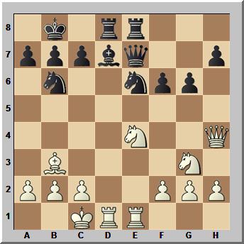 14…Te8 bringt den Turm ins Spiel und hebt die Fesselung des Springers auf. 15.Sa4 sieht Weiß etwas im Vorteil.
