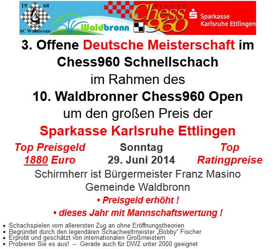 05.07.2014 - Am vergangenen Sonntag fand im malerischen Waldbronn (nahe Karlsruhe) bereits zum zehnten Mal das Chess960 Open im Schnellschacch statt, was zum dritten Mal zugleich die Deutsche Meisterschaft im Chess960 war. 65 Spieler rangen ohne anwendbare Eröffnungstheorie um Plätze und Preise - allen voran Favorit GM Klaus Bischoff von den Chess Tigers. Im dritten Anlauf schaffte der Wahl-Frankfurter den Sprung an die Spitze und hält damit nun wirklich alle möglichen deutschen Meistertitel. Zweiter wurde Chess960-As FM Igor Zuyev, der sich nur dem neuen Champion beugen musste. Zudem verteidigte Bischoff mit seinem Chess Tigers-Team erfolgreich den Mannschaftstitel. Zusammen mit FM Hartmut Metz, Hans-Walter Schmitt und Hans-Dieter Post verwies er die SF Neureut um einen Zähler auf den zweiten Rang. Sport-Journalist Metz hat unter dem obigen Titel einen Bericht verfasst, welchen wir Ihnen in der Folge präsentieren möchten.