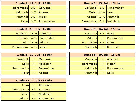 15.07.2014 - Drei der vier Partien der heutigen dritten Runde endeten bereits vor dem 40. Zug ohne Sieger. Und auch das mit .. Zügen längste Duell des Tages zwischen Vladimir Kramnik und David Baramidze war nur an einer Stelle wirklich spannend. Hätte der 14. Weltmeister im 28. Zug statt mit der Dame mit dem Bauern auf g7 geschlagen, seine Chancen auf den vollen Punkt wären ziemlich gut gewesen. So allerdings hielt der Deutsche den Laden zusammen und erkämpfte sich per Qualitätsopfer den ersten Halben. Bei vier Unentschieden ändert sich natürlich nichts an der Tabelle, und so führt weiterhin Fabiano Caruana. Runde 4 startet am Mittwoch um 15 Uhr. Das Spitzenduell lautet Caruana gegen Meier.