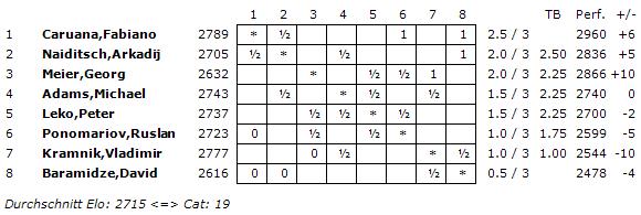 Mit einem ELO-Schnitt von ca. 2715 wurde in diesem Jahr die Turnierkategorie 19 erreicht.
