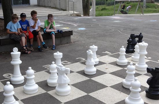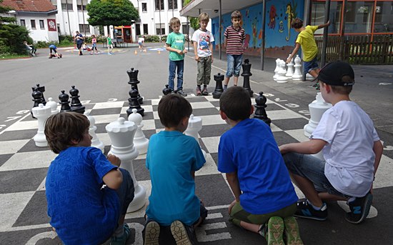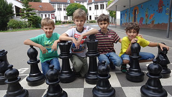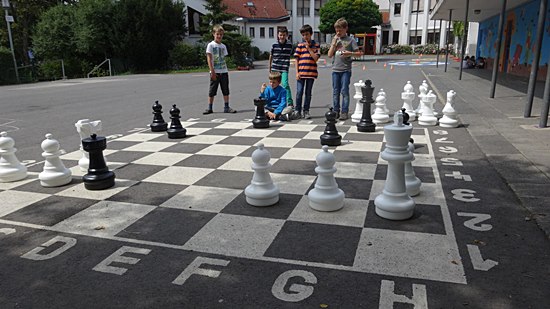 Schulschach Geschwister-Scholl-Schule Schwalbach - Brutstätte und Schachparadies Kreatives Schulkinderhaus, großer Schulhof, stille Leseinsel, Pokalschrank und jetzt das neue Freiluftschach heißen das Schach in Schwalbach herzlich willkommen!