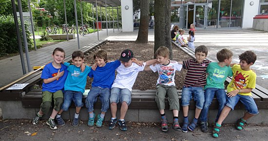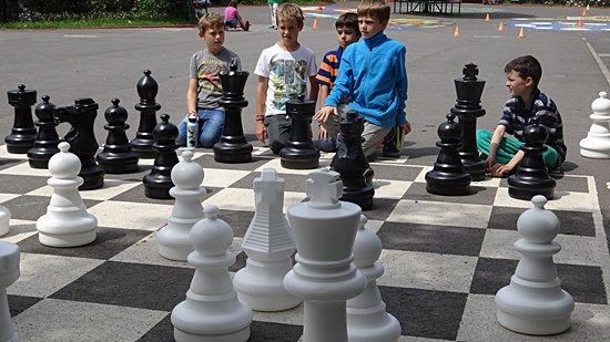 05.08.2014 - Das Vierkampf-Finale am Dienstag, den 22.Juli 2014, wurde zum krönenden Abschluss eines erfolgreichen Schuljahres 2013/2014. Der Bronceplatz - der zwei dienstags und donnerstags Gruppen - aus dem Schulschachturnier "Hibbdebach-Dribbdebach" mit dem Pokalgewinn war schon wichtig, aber jetzt stand die individuelle Meisterschaft an. Alle Schüler der Schach AG waren zur Stelle und freuten sich bei herrlichem Sonnenschein auf die finale Entscheidung. Heute stand noch das Einzelrennen und der Staffellauf um die Akazie "Weiße Rose" an und das alles entscheidende Team-Schachmatch auf dem neuen Freiluftschach. Es herrschte absolute Wettkampfatmosphäre. Keiner wollte auch nur einen Zentimeter beim Laufen verschenken und alle steckten den Kopf beim Team-Schach zusammen und wollten das beste Schach "ihres Lebens" zusammen spielen. Doch ehe es richtig zur Sache ging, nahmen die Jungs eine Anleihe bei der kürzlich erfolgreich ausgetragenen Fussballweltmeisterschaft in Brasilien und "schmetterten" textfest die deutsche Hymne: "Einigkeit und Recht und Freiheit für das deutsche Vaterland ... ". Es kam so einfach aus den Jungs heraus ohne jegliche Anweisung, ich war tief beeindruckt. Die kleinen Kerle, Schulter an Schulter mit der Hand auf dem Herzen ...