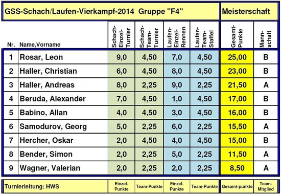 Die Turniertabelle F4 "Vierkampf" vom 22.Juli 2014 Klicken Sie auf die Tabelle für eine größere Ansicht.