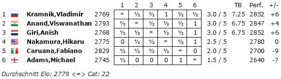 Mit einem ELO-Schnitt von 2779 wurde die Turnierkategorie 22 erreicht.