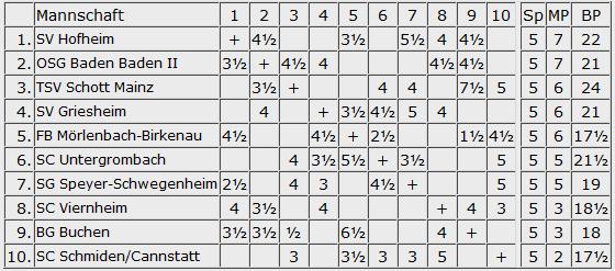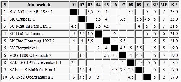 Insofern ist das noch etwas zaghaft, da die nah beieinander platzierten Klubs in dieser Staffel sich bis Platz 7 nicht aus den Augen verlieren; mittendrin auch Griesheim und Mörlenbach, nach Remis und auch Niederlage nur um einen Punkt von der Spitze getrennt. Sehr spannend!