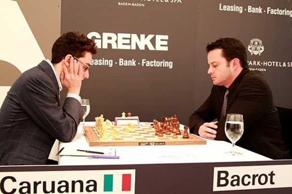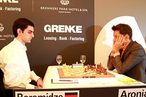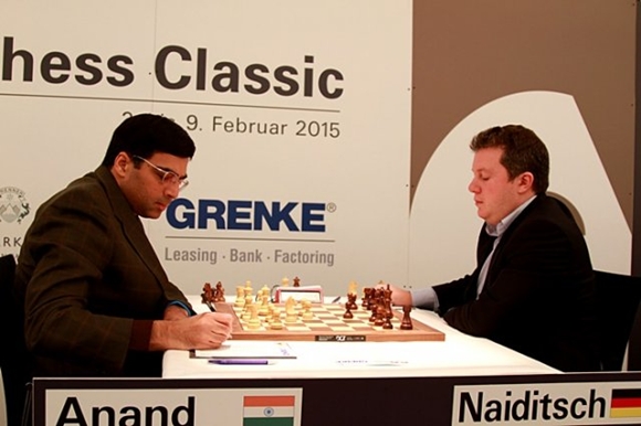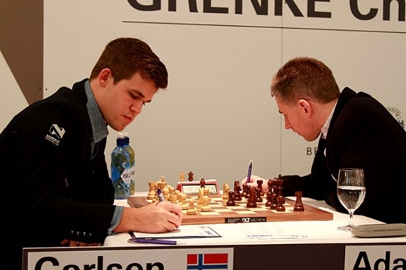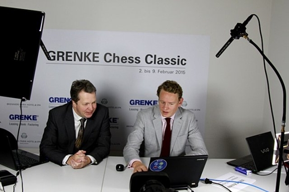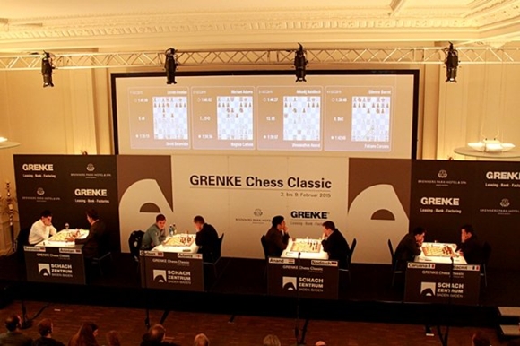 03.02.2015 - Sieben der bisher acht Partien der GRENKE Chess Classic endeten ohne Sieger, somit gibt es nun einen alleinigen Tabellenführer. Magnus Carlsen eroberte ausgangs des Mittelspiels einen Bauern von Michael Adams und ließ dem Briten in der Folge so gut wie keine Chance. Gut sah es zwischenzeitlich auch für Viswanathan Anand gegen Arkadij Naiditsch aus, doch der Deutsche verteidigte das Doppelturmendspiel gut und entwischte ins Remis. Nicht ganz zufrieden wird auch Fabiano Caruana sein, denn ihm reichte sein Mehrbauer gegen Etienne Bacrot nicht, um zu siegen. Die wenigste Spannung kam zwischen David Baramidze und Levon Aronian auf. Konsequent strebte der zweite Deutsche im Feld als Anziehender den halben Punkt an und bekam ihn auch relativ zügig. Runde 3 beginnt am Mittwoch um 15 Uhr.