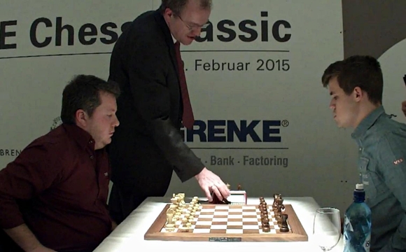 09.02.2015 - Es ging gut los für den Weltmeister im heutigen Tiebreak um den Sieg bei der 3. GRENKE Chess Classic 2015. In der ersten Partie mit 10 Minuten plus 2 Sekunden pro Zug führte Carlsen die weißen Steine und ließ seinem Gegner im Dameninder keine Chance. Die zweite Partie sah ein Vierspringerspiel, aber auch als Nachziehender war es recht bald Carlsen, der das Geschehen bestimmte. Naiditsch geriet unter Druck, aber plötzlich verlor Carlsen den Überblick und im wüsten Zeitnotgehacke geriet er auf die Verliererstraße. Zwar benötigte Naiditsch mehrere Anläufe, aber dann hatte er die zweite Stufe des Tiebreaks erreicht. Nun wurden zwei Partien mit 5 Minuten plus 2 Sekunden pro Zug gespielt. Wieder hatte Carlsen zuerst Weiß, doch dieses Mal hielt Naiditschs Stellung alle norwegischen Gewinnbemühungen aus. In der vierten Partie probierte man sich am Berliner Endspiel, welches beinahe an den Weltmeister gegangen wäre. Doch die deutsche Nummer 1 verteidigte sich brillant, und so musste tatsächlich eine Armageddon-Partie angesetzt werden. Weiß erhielt 6 Minuten und musste gewinnen, Schwarz erhielt 5 Minuten und benötigte nur ein Remis. Zusätzlich gab es die gewohnten zwei Sekunden Bonus pro Zug. Carlsen erhielt Weiß und dieses Mal gab es kein Erbarmen für seinen Gegner. Nach einem schweren Überseher musste Naiditsch seinem Gegenüber zum glücklichen Turniersieg gratulieren. Doch er braucht sich nicht zu grämen, hat er doch ein hervorragendes Turnier gespielt und dabei gleich zwei Mal die Nummer 1 der Welt geschlagen!