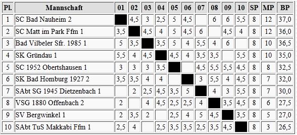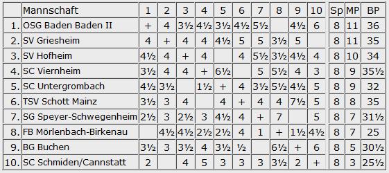 Schon wesentlich klarer sieht es dagegen im Süden aus, Gernsheim ist der Aufstieg kaum noch zu nehmen. Brett vorm Kopp und der Wiesbadener SV werden wohl in die Landesklasse absteigen müssen.