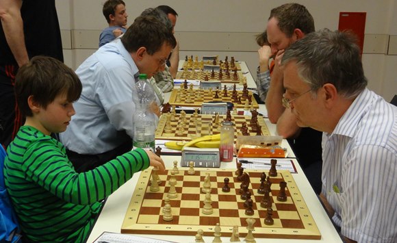 20.04.2015 - Das 3.Frühjahrs-Open des SV Hofheim mausert sich mehr und mehr zur Begegnungsstätte zwischen talentierten Jugendspielern und etablierten Titelträgern. In der A-Gruppe waren die Duelle des erst zehnjähigen deutschen Hoffnungsträgers Vincent Keymer vom SK Gau-Algesheim und den Großmeistern Alexandre Danin und Vitaly Kunin von größter Anziehungskraft für die Teilnehmer und die interessierten Zuschauer. Dabei stellt sich immer die Frage: "Für wenn ist es leichter diese "ungleichen" Partien zu spielen - für den jungen Tiger Vincent Keymer aus Mainz mit Elo 2364 oder für die etablierten Großmeister aus unserer Region mit fast 2600?" Etwas ruhiger und unaufgeregter ging es da schon im neunrundigen B-Open zu, aber auch hier standen die Jungendlichen im verstärkten Interesse. Wie es dem einzigen Bad Sodener Spieler und Tiger der 1.Generation Leo Max Deppe erging, können Sie bereits in der Überschrift ablesen, aber auch der etablierte Bad Sodener Ralf Kellerwessel schlug sich prächtig. Der positive Konflikt zwischen "Jung und Alt" beim SC Bad Soden beginnt Früchte zu tragen, denn der SC Bad Soden 3 (die Alten) und der SC Bad Soden 4 (die Jungen) sind gemeinsam ungeschlagen mit 13:1 Punkten als Erster & Zweiter der Liga aus der Bezirksklasse C gestern in die Bezirksklasse B aufgestiegen.