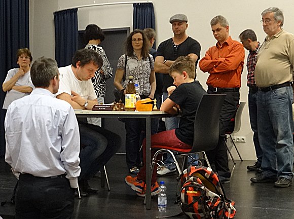 Das Duell "Alt gegen Jung" konnte noch einmal der Erfahrenere Eduard Schwarz von der SG Turm Idstein gewinnen. Am Schluss war Schwarz 1. mit 8/9 und der junge Alexander Krastev mit 7/9 2. im B-Turnier. Oben auf der Bühne kündigte sich schon an Brett 3 die spektakuläre Partie zwischen dem 10-jährigen Vincent Keymer und dem erfahrenen Großmeister Vitaly Kunin an.