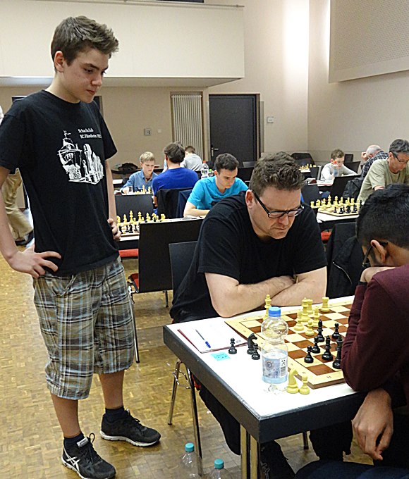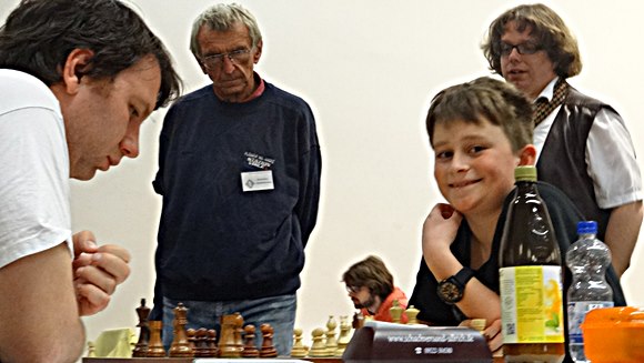 Vater Christof Keymer (rechts) als interessierter Beobachter. Die Eltern begleiten den Jungen "fulltime" beim Schachspielen und auch Bernd Vökler als deutscher Jugend- und Nachwuchstrainer ist ständig mit von Vincents Partien.