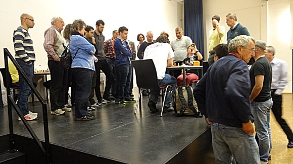 Großes Interesse und Mitfiebern bei den Zuschauern. Von links neben FM Dr. Zunker die Beschützerin des kleinen Mannes, Mama Keymer. Die Traube um das dritte Brett auf der Bühne wurde mit zunehmendem Fortschritt und Ausgeglichenheit der Partie immer größer ...