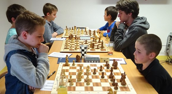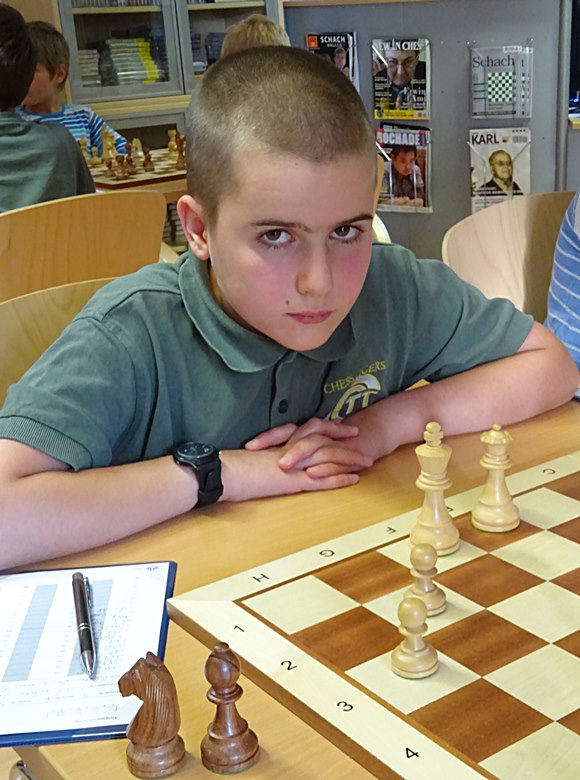 Am Hauptspieltag "Mittwoch" gab es 10 Begegnungen, die es in sich hatten, sowohl in der Spitze, als auch in der Breite. Leo Max Deppe machte seinen Job nahezu perfekt ohne Schwierigkeiten aufkommen zu lassen gegen den 10-jährigen Kevin Haack. Seine mittlerweile erreichte DWZ von 1718 verschafft ihm schon die klare Favoritenrolle, der er auch voll gerecht werden will. Etwas überraschend schlug Ruben Rittberger (DWZ 1364) den höher gerateten 10-jährigen Adam-Kristof Baranyai-Molnar (DWZ 1562) nach ausgeglichenem Spielverlauf in einer Italienischen Partie, die er dann in einem ausgeglichenem Turmendspiel noch für sich entschied, so kommt es jetzt in der 6.Runde zum großen Showdown zwischen Ruben und Leo, wobei Ruben schon versuchen muss auf Sieg zu spielen, weil Leo einen halben Punkt vorne liegt. Am dritten Brett ließ Jan Frederik Werndl gegen den fast 17-jährigen Leon Patalen wahrscheinlich in seinem zweiten Skandinavier den Sieg aus und musste nach langem Spiel einem kapitalem Bock mit Turmverlust Tribut zollen. Am vierten Tisch erreichte der 9-jährige Boyan Blagoev ein Remis (Patt) durch einen finalen Überseher des erfahrenen Lukas Martin, hatte aber in einer 1.d4-Eröffnung (Damenbauernspiel) nach 12 Zügen eine mehr als ausgeglichene Stellung mit Schwarz erreicht und hätte einen gesunden Mehrbauern realisieren können. Lukas Spielstärke setzte sich aber dann im Verlauf immer mehr durch, bis am Ende dann dieser Fauxpas ihm unterlief in einer gewonnen Stellung. James Weller hatte mit Schwarz am 5.Tisch Andreas Haller mit einer "offenen" Italienischen Partie vor ein unbekanntes System gestellt, welches er bis zum Schluss ohne große Schwierigkeiten nach Hause brachte. Hier muss Trainer Mike Rosa nacharbeiten. Boris Blagoev entfachte am 6.Tisch nach einem Figurenopfer einen unwiderstehlichen (dacht er) Königsangriff, welcher auch nach Dg3+ und Dg7+ Matt fruchtete, aber Andrius Paukstys hätte auch einfach den Tf8 hergeben können nach Lh6 und nichts wäre gewesen. Nur dem Mutigen fallen so die Punkte zu, jetzt schon zum zweiten Mal! Maribel Wagner kam zum allerersten Sieg nach einem kraftvollen Damenmanöver und heimste so ihren allerersten Sieg durch Mattsetzen ein, die Freude war rießig über das schöne Matt und der Eifer für die letzten zwei Runden voll entfacht.