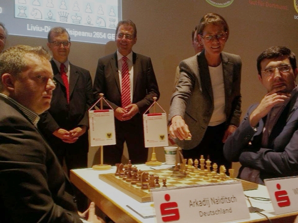 Frau Bürgermeisterin durfte den ersten Zug des Turniers für Vladimir Kramnik gegen Arkadij Naiditsch ausführen