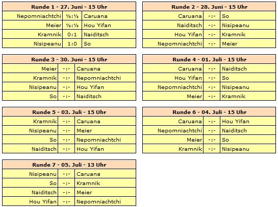 Gespielt wird ein siebenrundiges Rundenturnier mit acht Spielern. Rundenstart ist täglich um 15 Uhr unserer Zeit - lediglich die letzte Runde startet bereits um 13:00 Uhr. Ruhetage werden am 29. Juni und 02. Juli eingelegt.