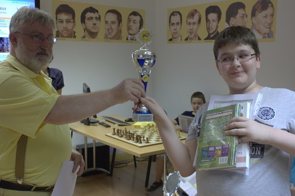 1.JBEM-BS-2015 - Adam-Kristof Baranyai-Molnar war mit seinem 3.Platz im Blitzturnier nicht so glücklich, aber mit seinem U12-Meister-Titel um so mehr.