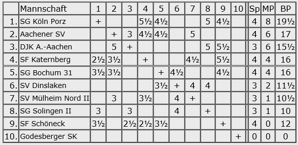 Nun, es gibt schlimmeres als gegen die SG Porz mit 3,5 zu verlieren, aber am Ende trauert man vielleicht doch noch der einen oder anderen Chance nach, wenn man jeden halben Brettpunkt gegen den Abstieg brauchen kann.