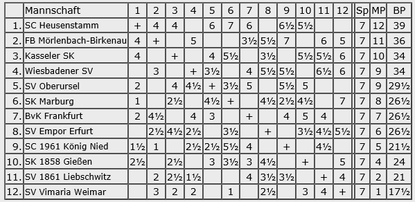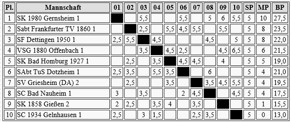 Gernsheim plant wohl einen sauberen Durchmarsch zum Oberligaaufstieg, jedenfalls folgte schon der 5. Sieg in Serie. Wenn da nicht das schlechte Brettpunktkonto wäre, könnte der Frankfurter TV auch noch ein Wörtchen mitreden, aber ich schätze, das wird zu knapp.