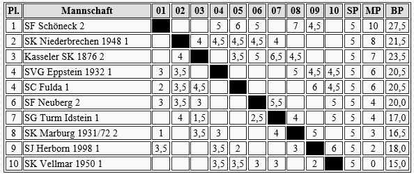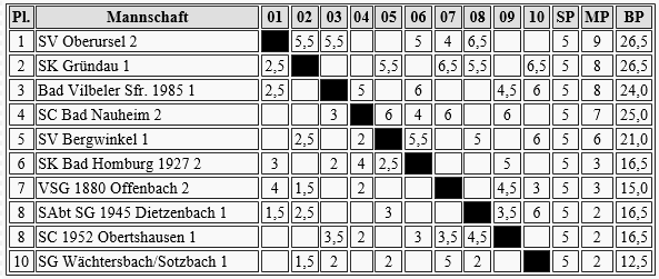 Die guten Aussichten, was den Oberligaabstieg angeht, bedeuten wohl einen Zweikampf zwischen Gießen 2 und Gelnhausen um den wichtigen vorletzten Platz. In der übernächsten Runde dürfte es zum entscheidenden Showdown kommen.
