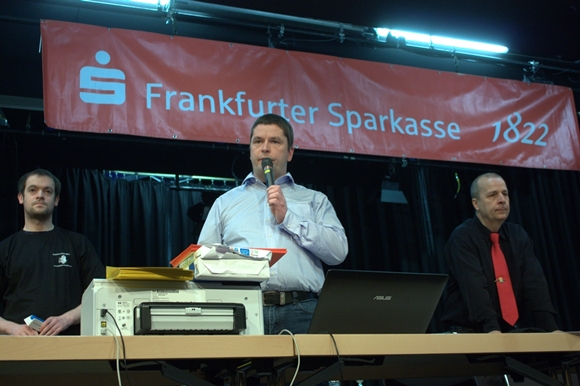 "Hibbdebach-Dribbdebach" - der Vorsitzende der Hessischen Schachjugend Simon Martin Claus erklärt die letzten Turnierregeln und Marketingleiter Thomas Walther von der Frankfurter Sparkasse 1822 sorgt für die schönen Sieger-Preise und Urkunden und Medaillen für alle!