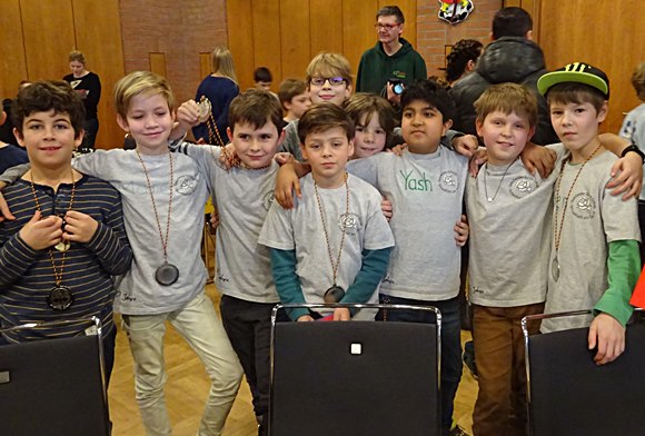 "Hibbdebach-Dribbdebach" - das Team der Anna-Schmidt-Grundschule hatte Großartiges geleistet und nur hauchdünn eine Medaille verpasst. Nur gegen die haushohen Favoriten von der Kinzigtalschule aus Gründau mussten sich die jungen Strategen der Anna-Schmidt-Schule beugen, wobei Alexander Schulz der einzige volle Punkt gelang. Respekt, in der Besetzung Victor Tieves, Igor Yao, Benedikt von Rosen, Marie-Luise Schiefer, Leonard Gehrke, Michelle Lanin, Alexander Schulz, Fabian Schmutzler und Johanna Wietig konnten die Schüler mit der betreuenden Lehrerin Milena Englert und Trainer Elmar Kaiser einen sehr guten Platz erreichen bei 22 teilnehmenden Teams.