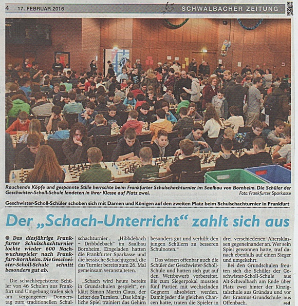Das traditionelle Frankfurter Schulschachturnier Wieder einmal glänzend besetzt und wunderbar organisiert von der Frankfurter Sparkasse 1822 und der Hessischen Schachjugend - dankeschön hierfür!